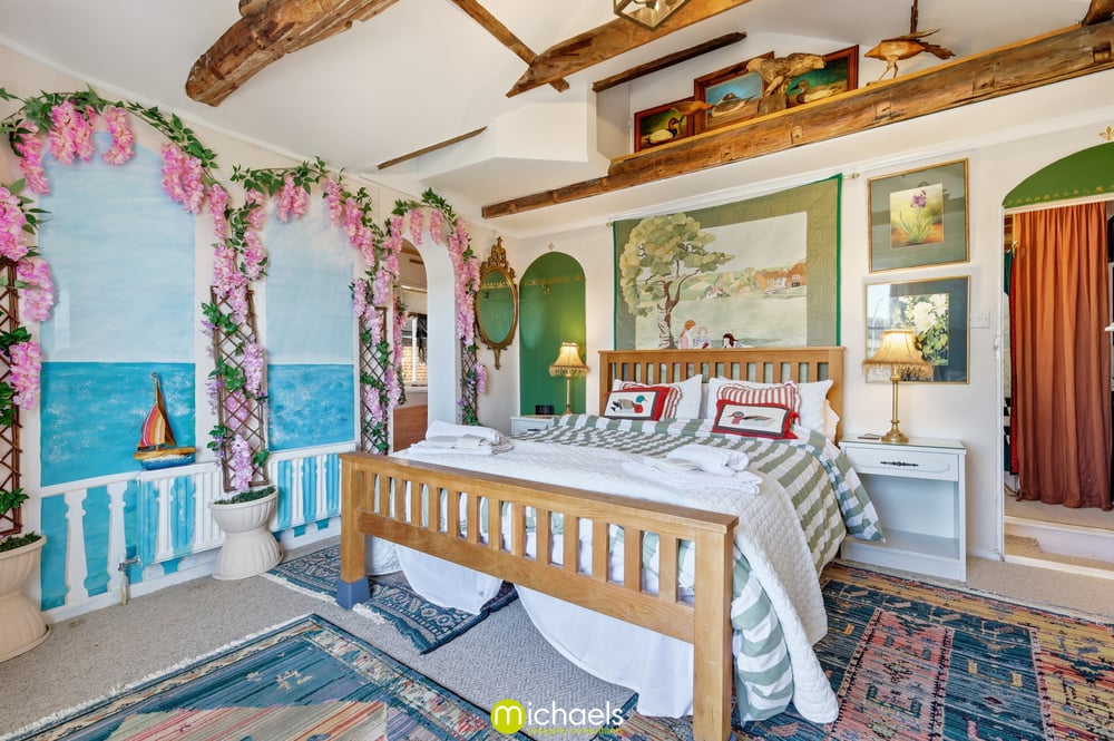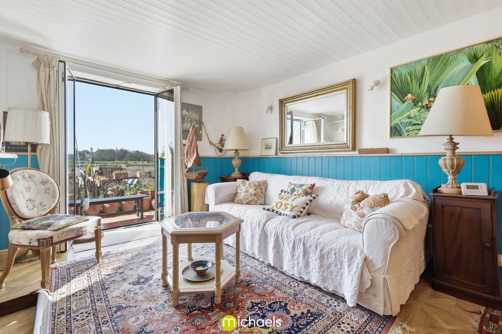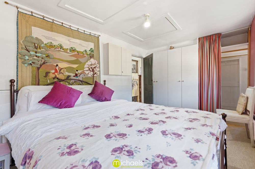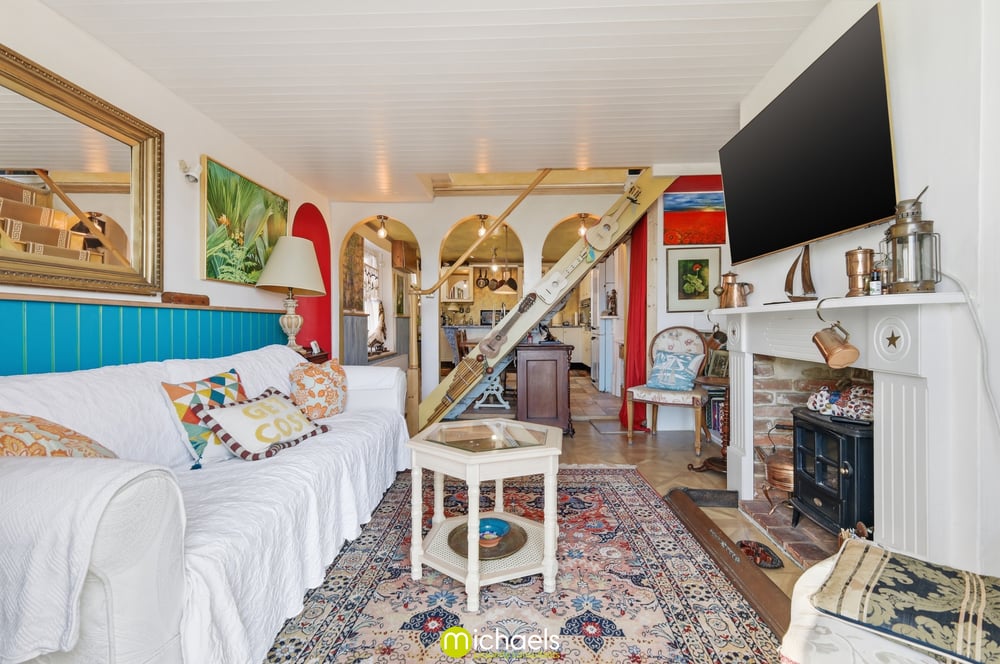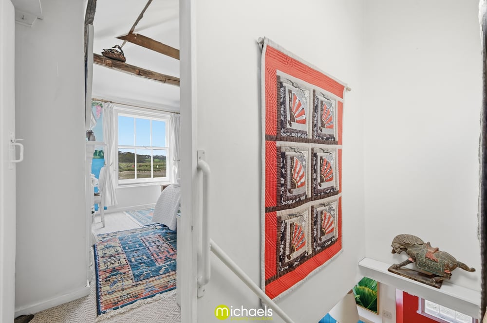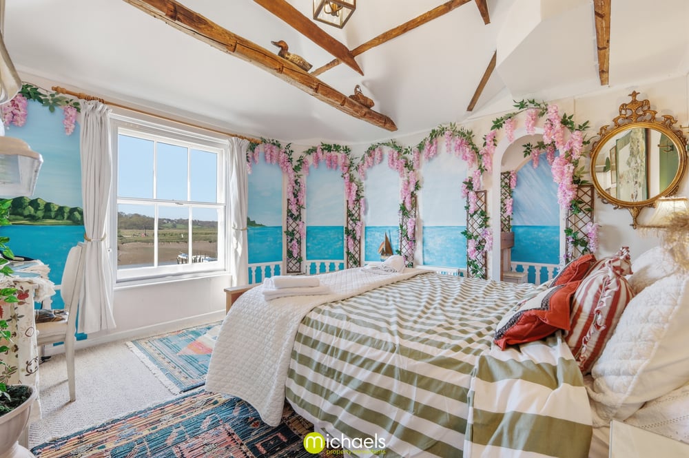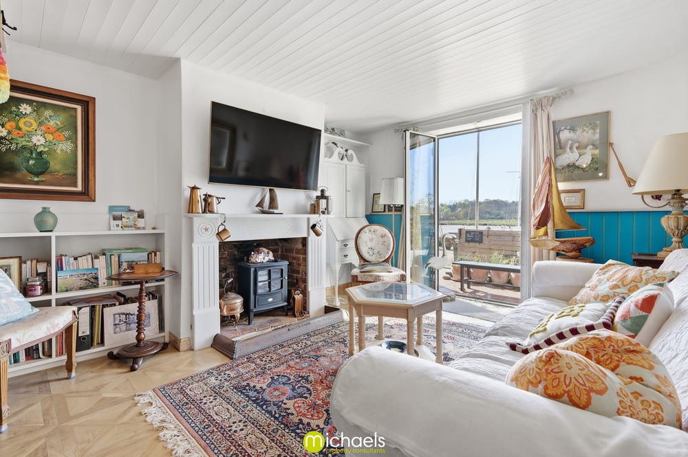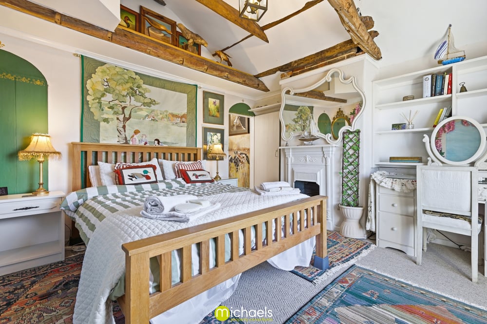 13' 1" x 11' 10" (3.99m x 3.61m) Sash window to front with views onto the estuary, radiator, cast iron fireplace, fitted storage, part vaulted ceiling with exposed timbers, radiator and open to.