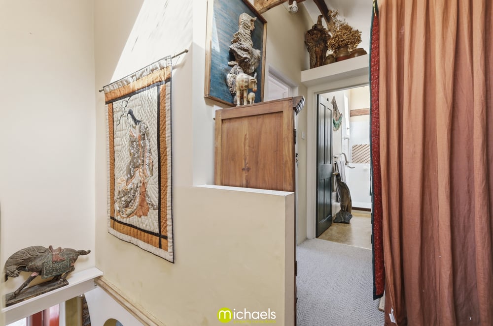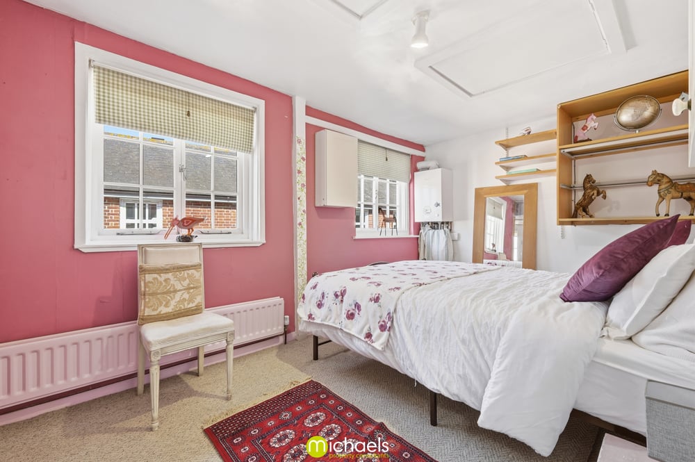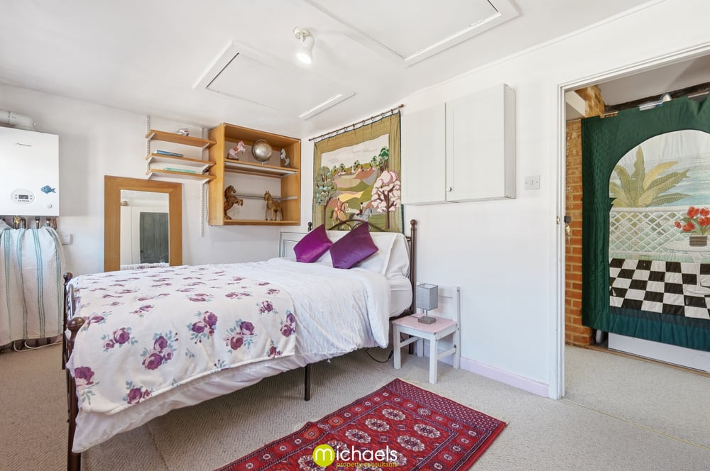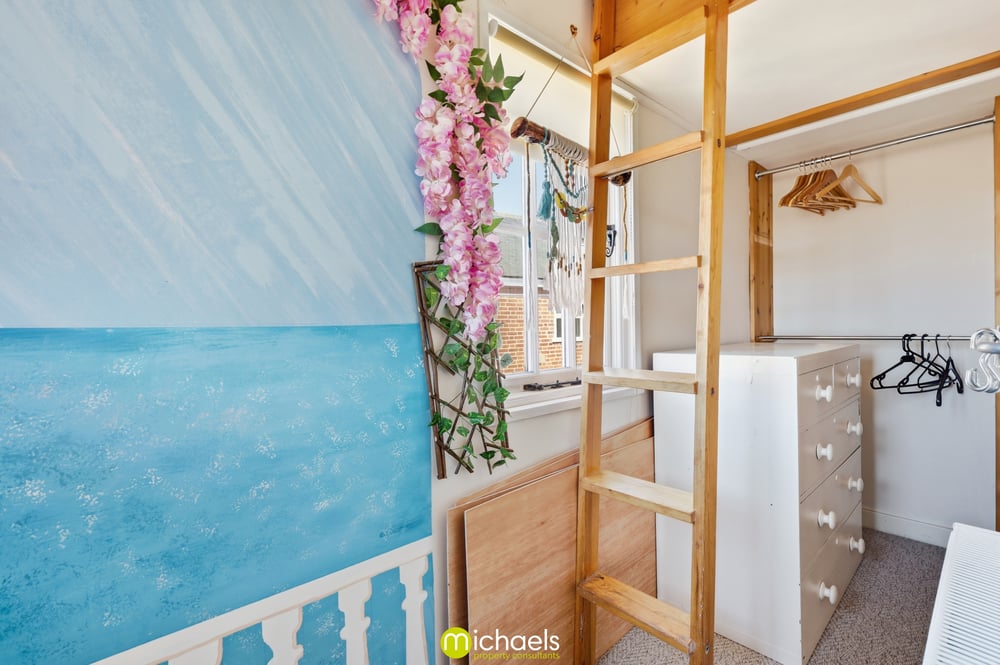 11' 03" x 2' 11" (3.43m x 0.89m) Turning to 7' 08" x 5' 4" (2.34m x 1.63m) Windows to front and side, stairs to mezzanine area with space for mattress, fitted shelving and currently open to 2nd bedroom.