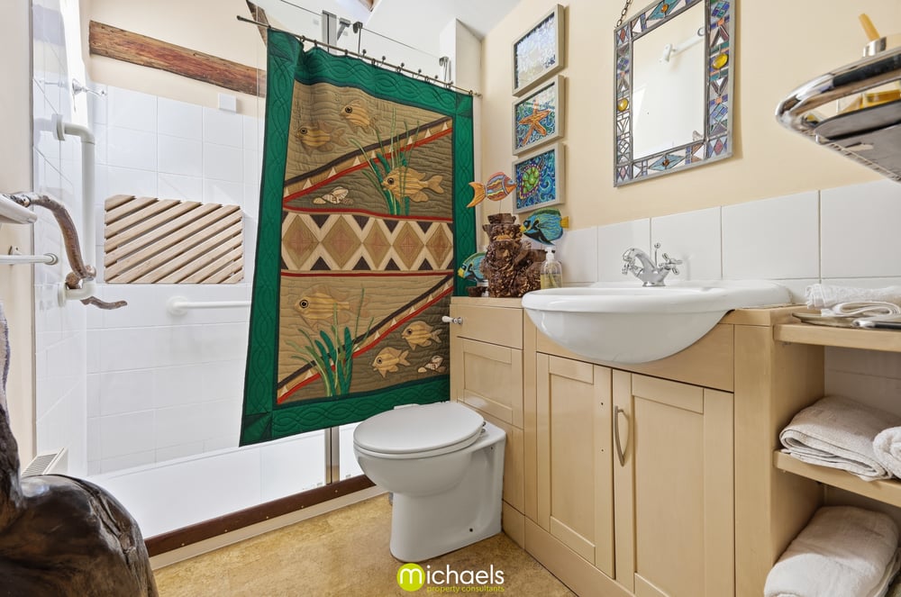 Velux window, shower enclosure with tiled walls, low level WC, wash hand basin.