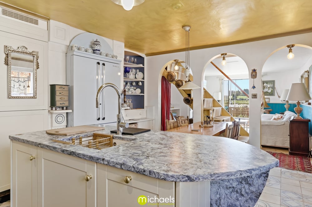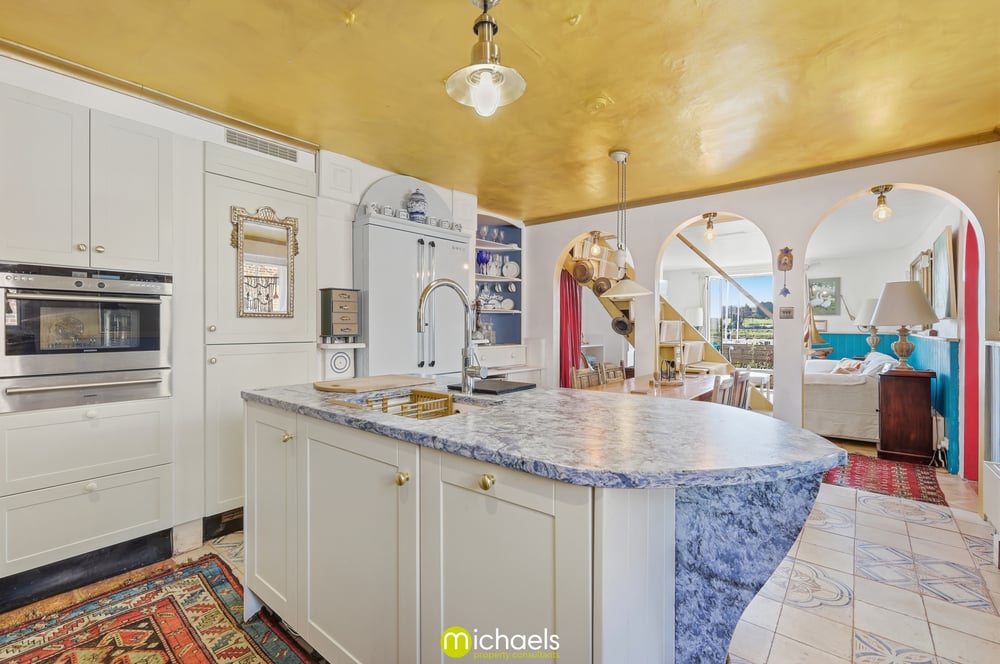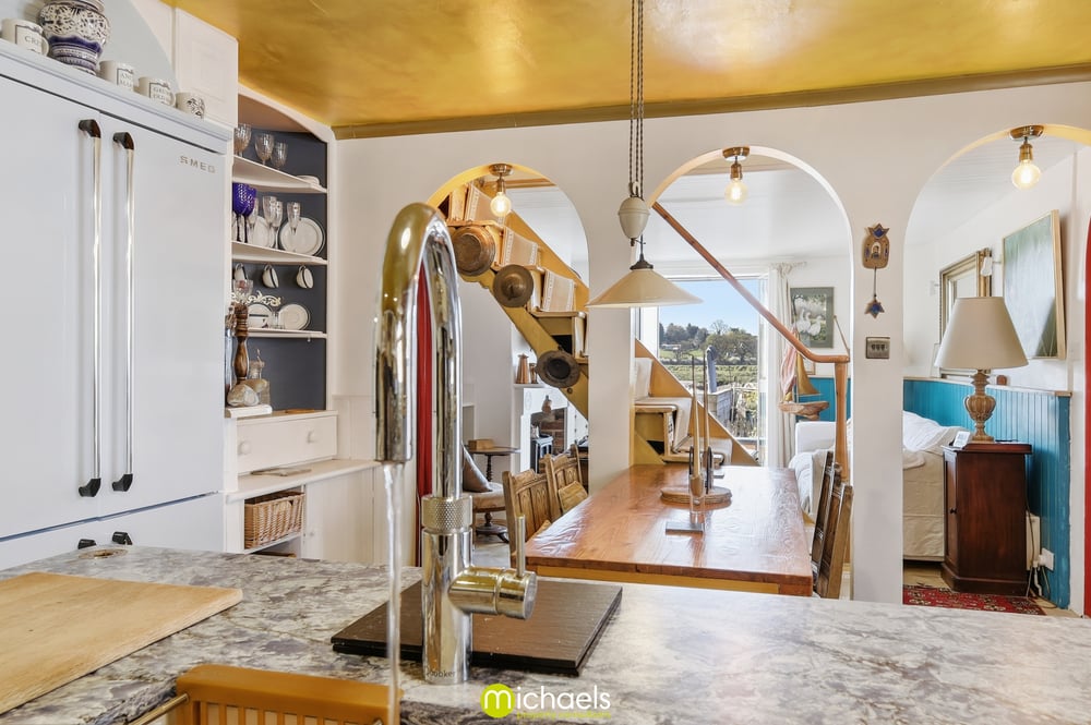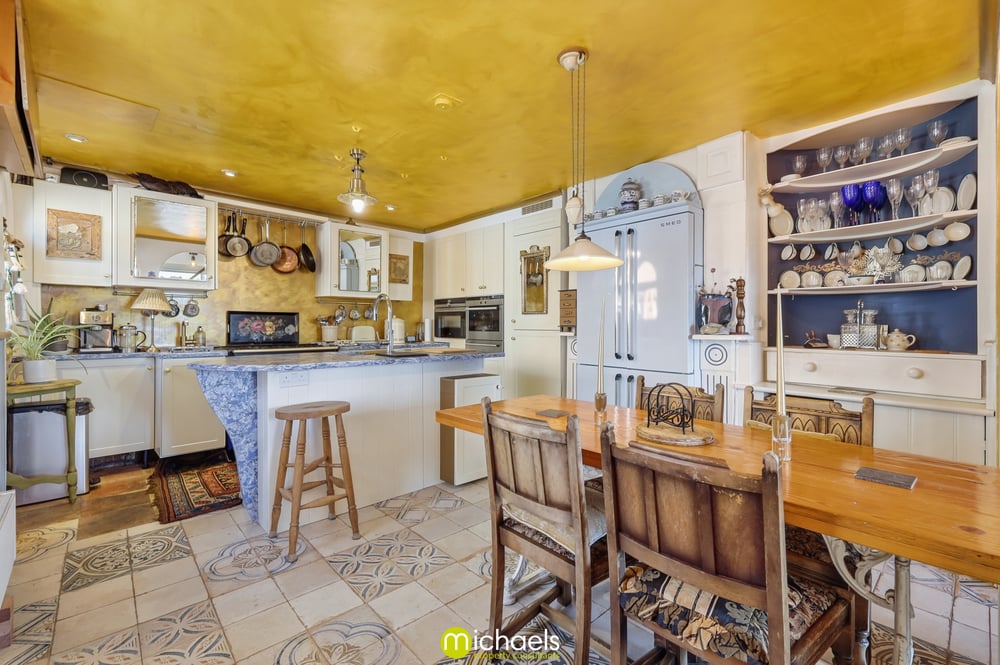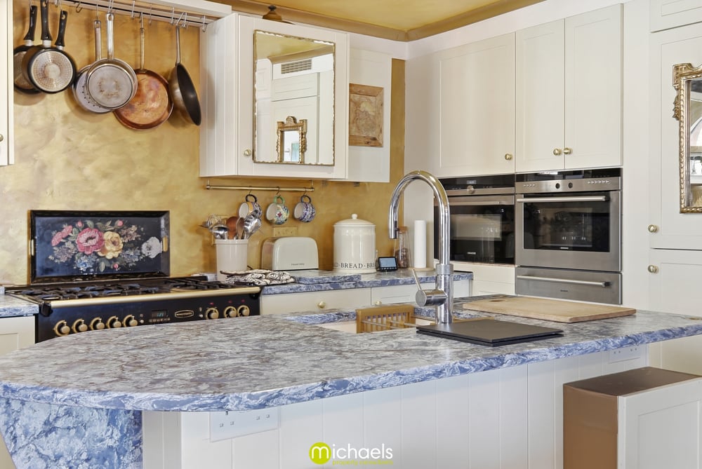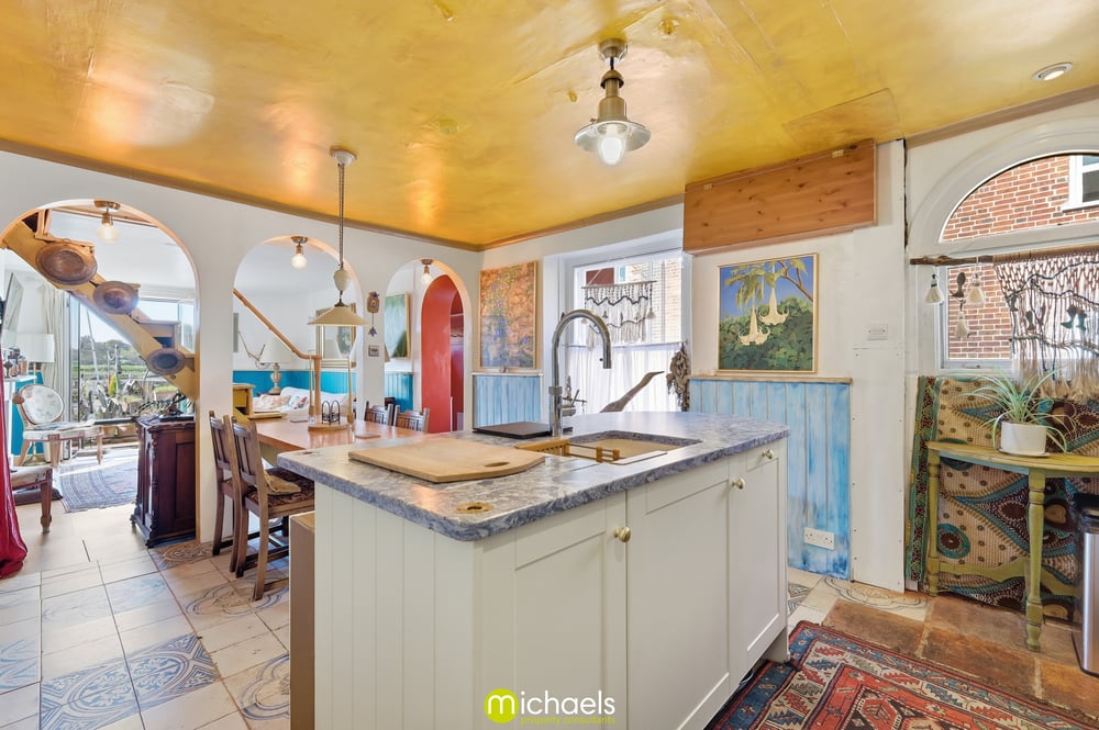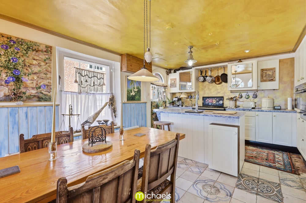 15' 3" x 13' 1" (4.65m x 3.99m) Tiled floor, two windows to side, a comprehensive range of fitted units and drawers with stone worktops over, range cooker, fitted oven, steam oven and combi oven, integrated fridge/freezer, inset sink, integrated dishwasher, central nautical shaped island with inset sink, Quooker hot tap, inset SMEG fridge, radiator, Essex cupboard inset and ample space for dining table.