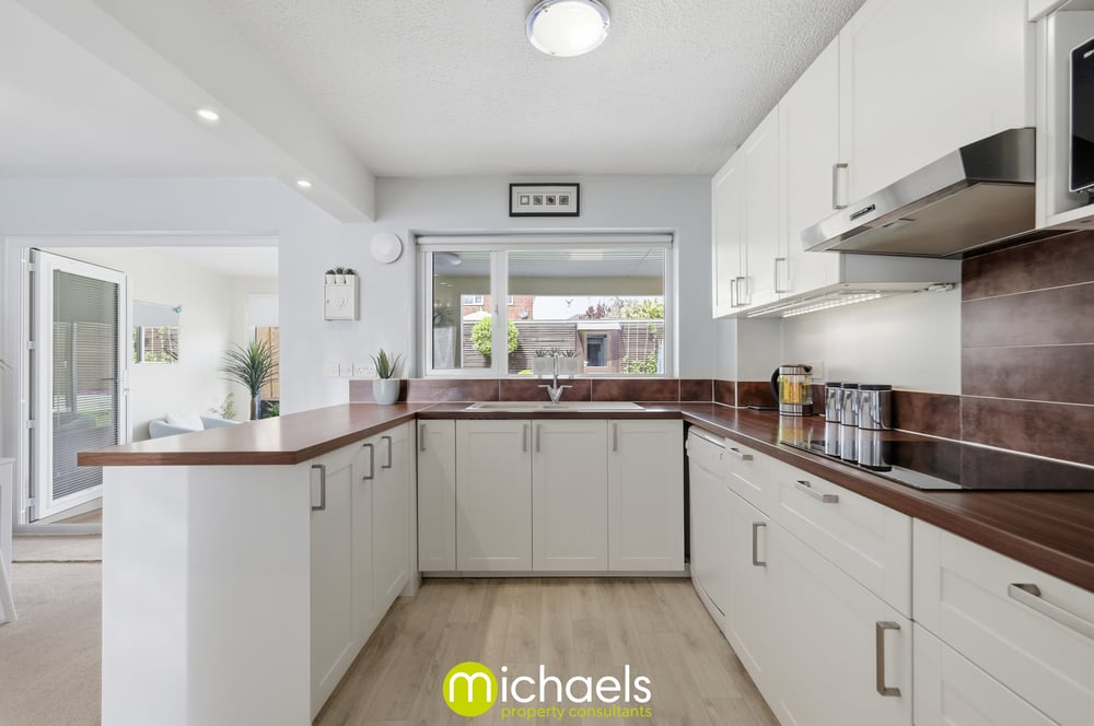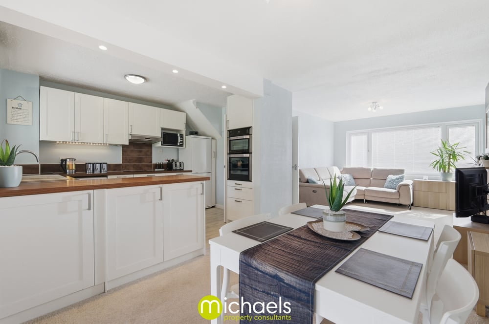 To the rear, the home opens up into a modern fitted kitchen, finished with a range of contemporary units and ample work surfaces, flowing seamlessly into a further reception/living area. This open-plan layout creates an ideal space for everyday living and entertaining, with direct access via patio doors into the garden.