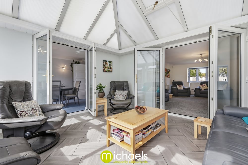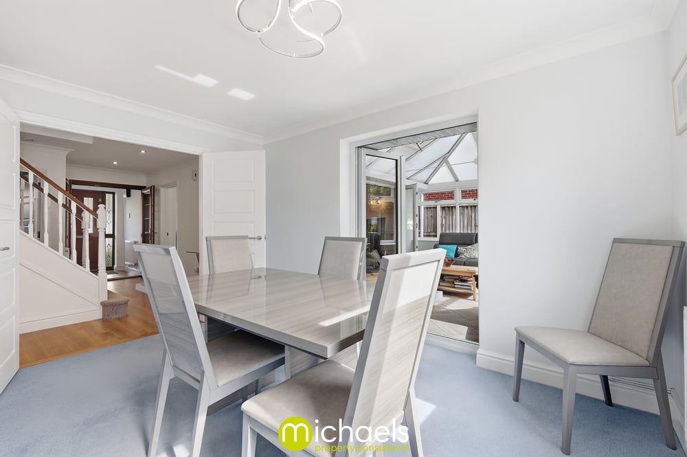 The dining room sits centrally within the home, providing an ideal space for entertaining and family meals, and leads through to the conservatory, which benefits from a tiled floor, gas central heating, and attractive views over the garden—making it a versatile year-round living space.
