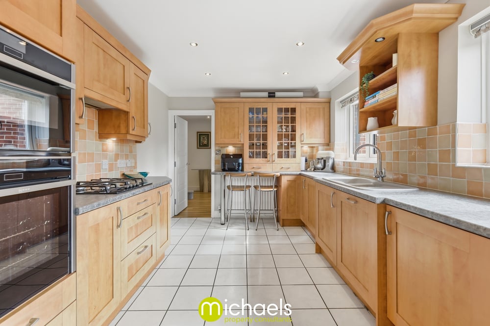 The kitchen is fitted in a classic shaker style, featuring a tiled splashback, breakfast bar, and inset appliances. From here, there is access to a separate utility room and internal access to the integral double garage, adding practicality to the layout. A study offers a perfect work-from-home space, while a ground floor WC completes the downstairs.