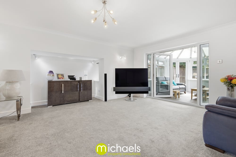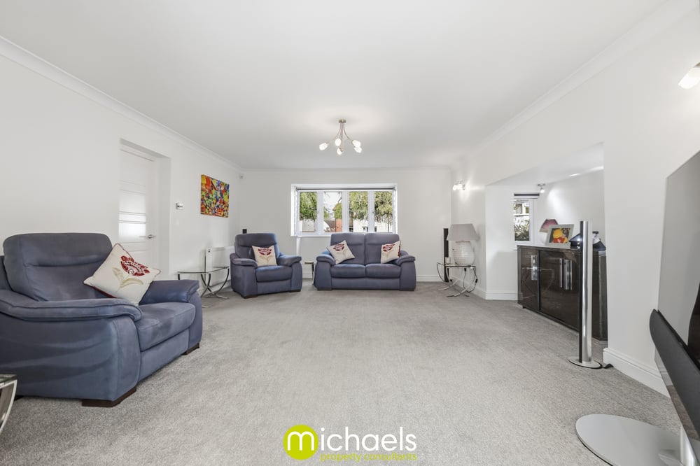To the front, the living room is a generous and inviting space, complete with a recessed area with spot lighting, dual aspect windows allowing for excellent natural light, and wall-mounted lighting creating a warm atmosphere.