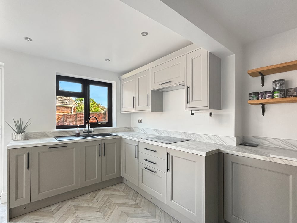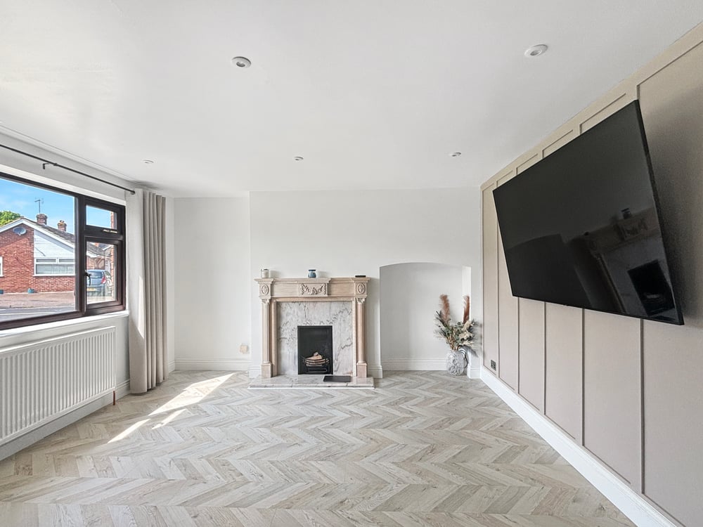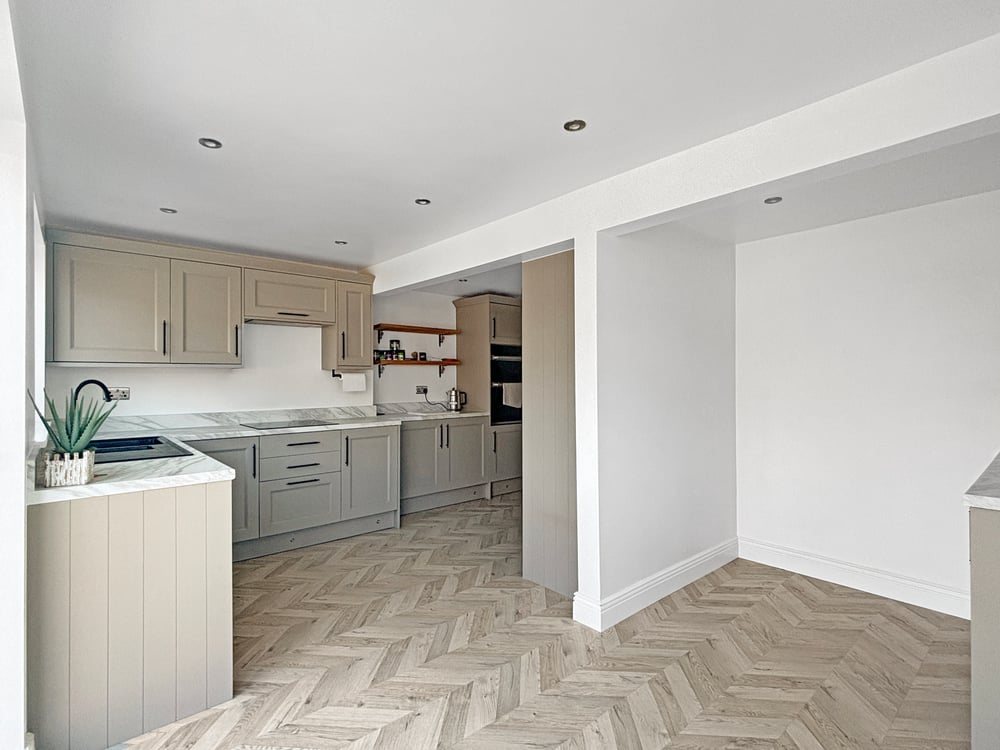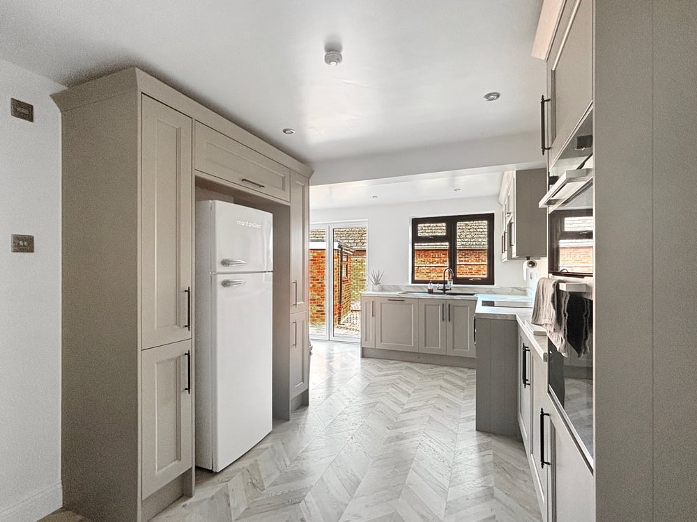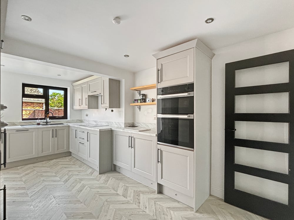 17' 3" x 9' 09" (5.26m x 2.97m) Double glazed windows to rear and side, bifold doors, inset spotlights, radiator, open kitchen/diner, the kitchen includes a range of wall and base units, marble effect worktops, inset one and half bowl sink, integrated dishwasher, electric hob, double oven and space for American style fridge /freezer.