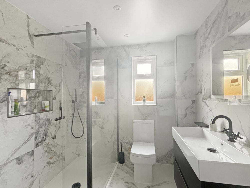Inset spotlights, tiled floor and walls, WC, walk in shower, wall hung basin, towel rail.