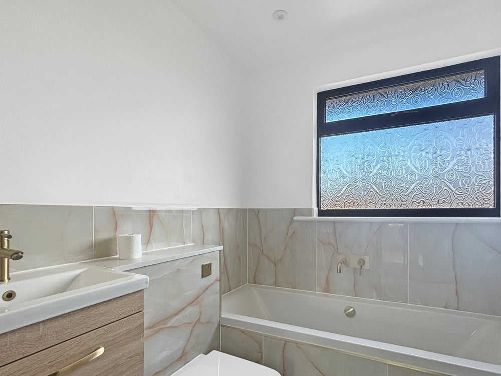 9' 6" x 6' 10" (2.90m x 2.08m) Double glazed obscure window to rear, part tiled walls, tiled floor, radiator, vanity unit, low level WC and paneled bath.