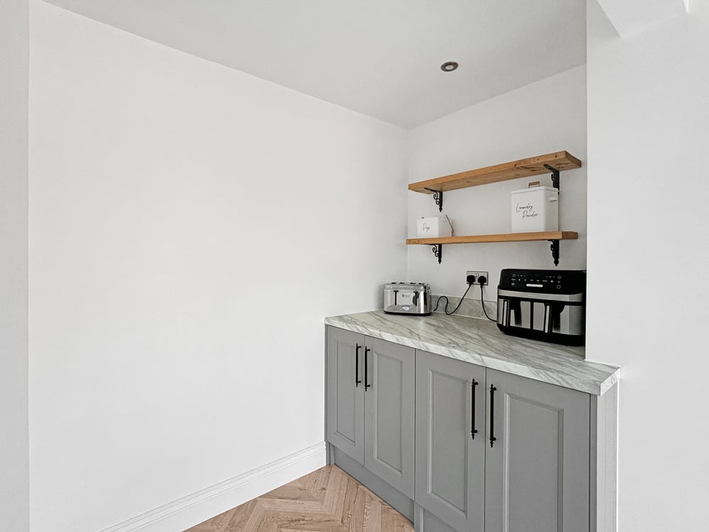 7' 0" x 5' 06" (2.13m x 1.68m) Inset spotlights, marble effect worktop, space for washing machine.