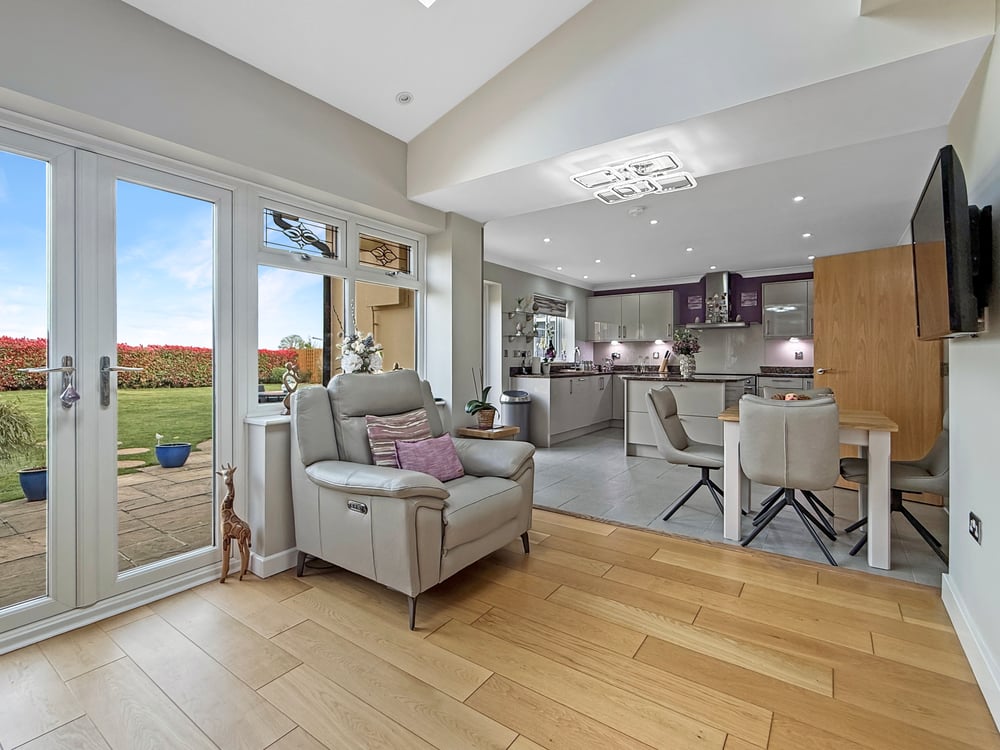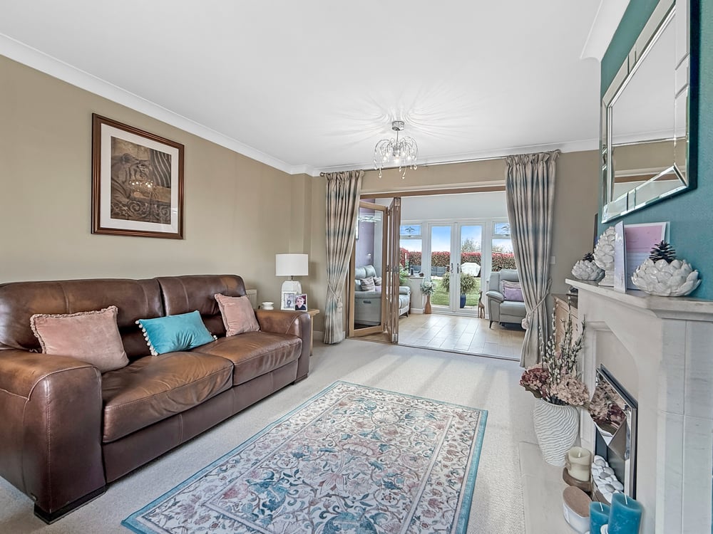 The impressive ground floor accommodation comprises a welcoming entrance hall with a solid oak staircase, a cloakroom, a spacious living room, a formal dining room, a snug/study, and a large kitchen/breakfast room. The kitchen features a central island and granite worktops, and opens into a recently added sunroom that brings in an abundance of natural light.