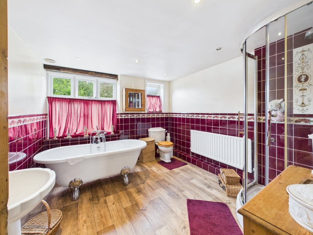 A split-level landing leads to three well-proportioned double bedrooms and a generous four-piece family bathroom suite. Externally, the property continues to impress.