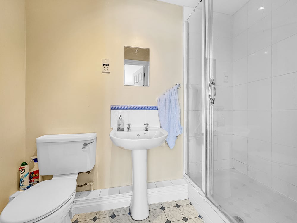 8' 04" x 3' 10" (2.54m x 1.17m) Radiator, extractor fan, low level WC separate shower enclosure with tiled splash back, hand basin.