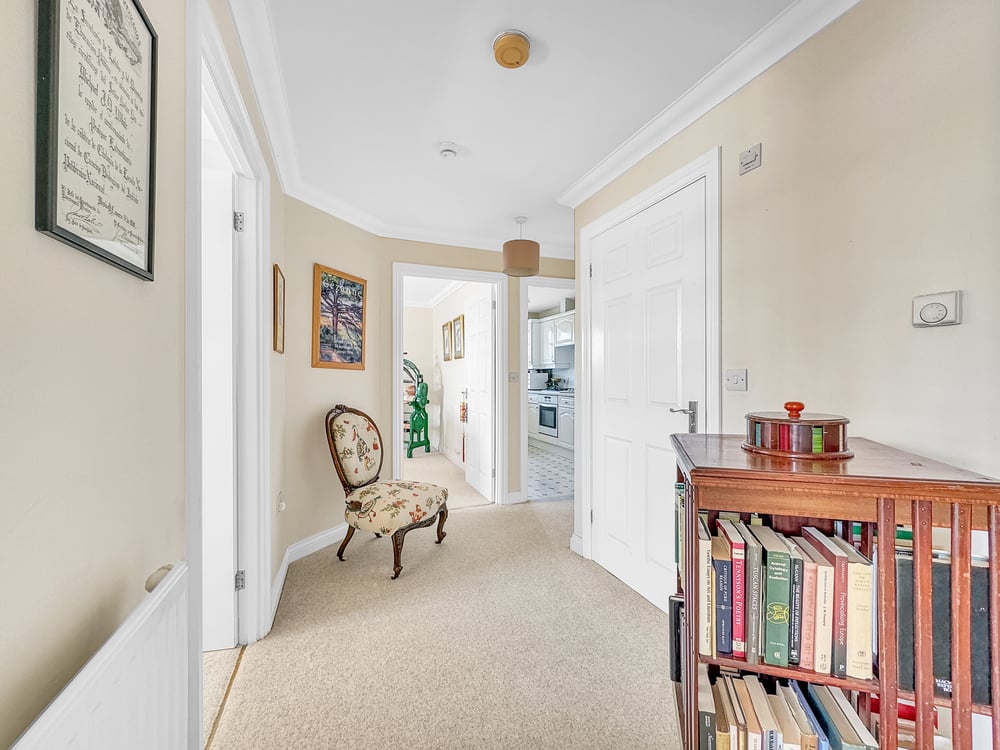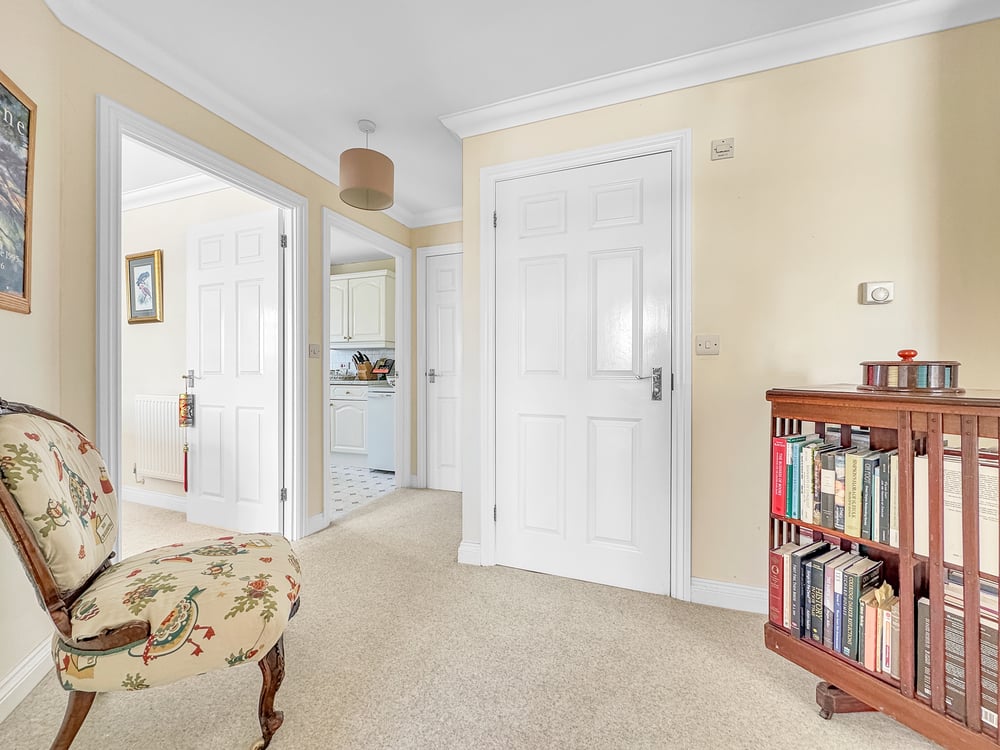 Timber front door opening onto hallway, including storage, airing cupboard, smoke alarm, doors leading to: