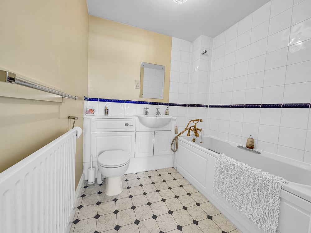 7' 0" x 6' 06" (2.13m x 1.98m) White bathroom suite including panelled bath, vanity unit with wash hand basin and WC, execrator fan to the ceiling.