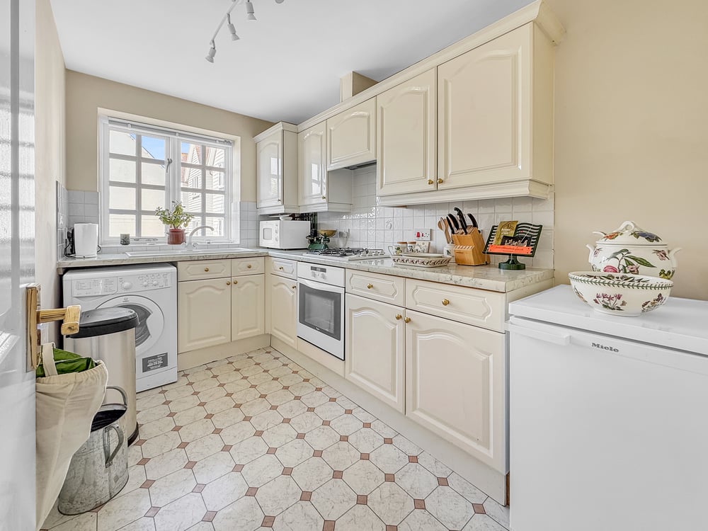 11' 11" x 6' 06" (3.63m x 1.98m) Double glazed window to side, radiator, range of wall and base units, roll top work surfaces, tiled splash back, integrated one and a half bowel sink with left hand drainer, oven, gas hob and over head extractor fan, space for washing machine and fridge freezer
