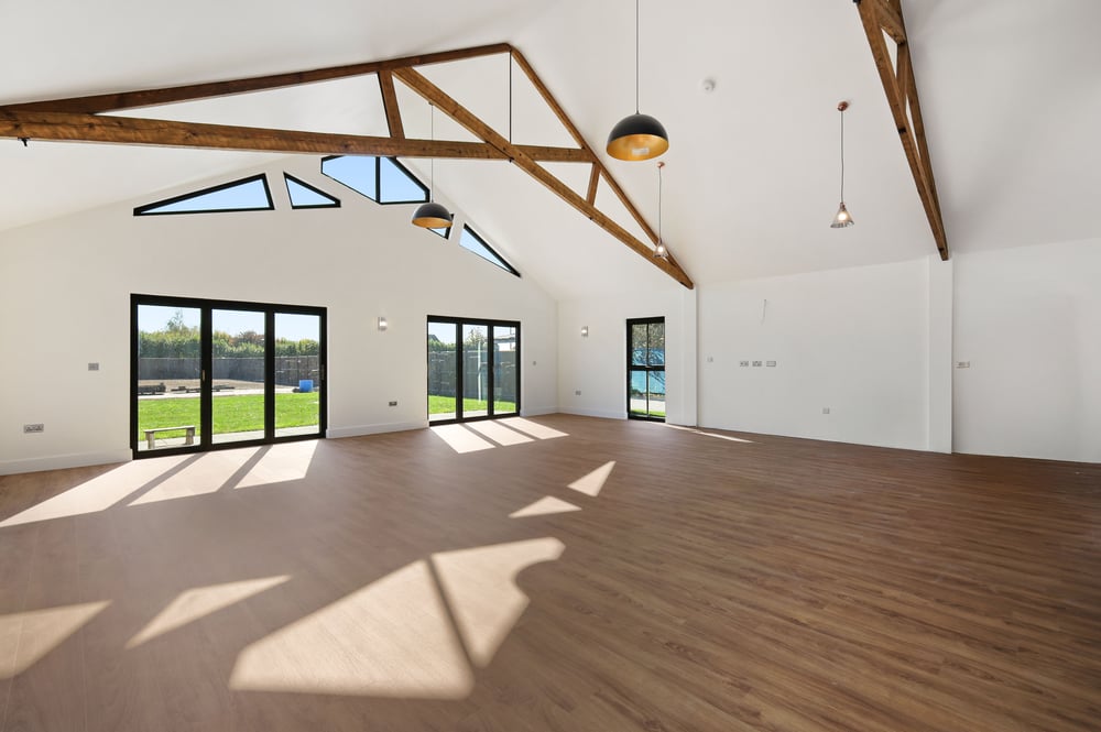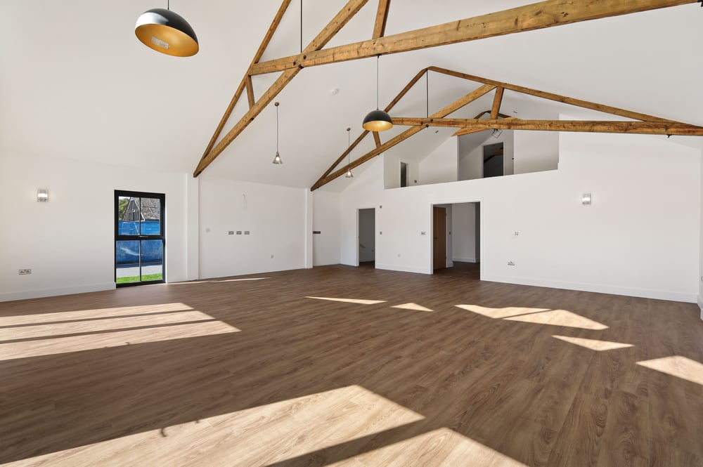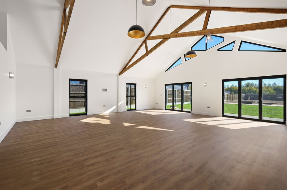 28' 1" x 28' 6" (8.56m x 8.69m) With twin sets of doors to garden, three windows to sides, LVT flooring with heating under, vaulted ceiling with exposed beams and feature windows. Kitchen specification can be reviewed with buyer subject to stage of build.