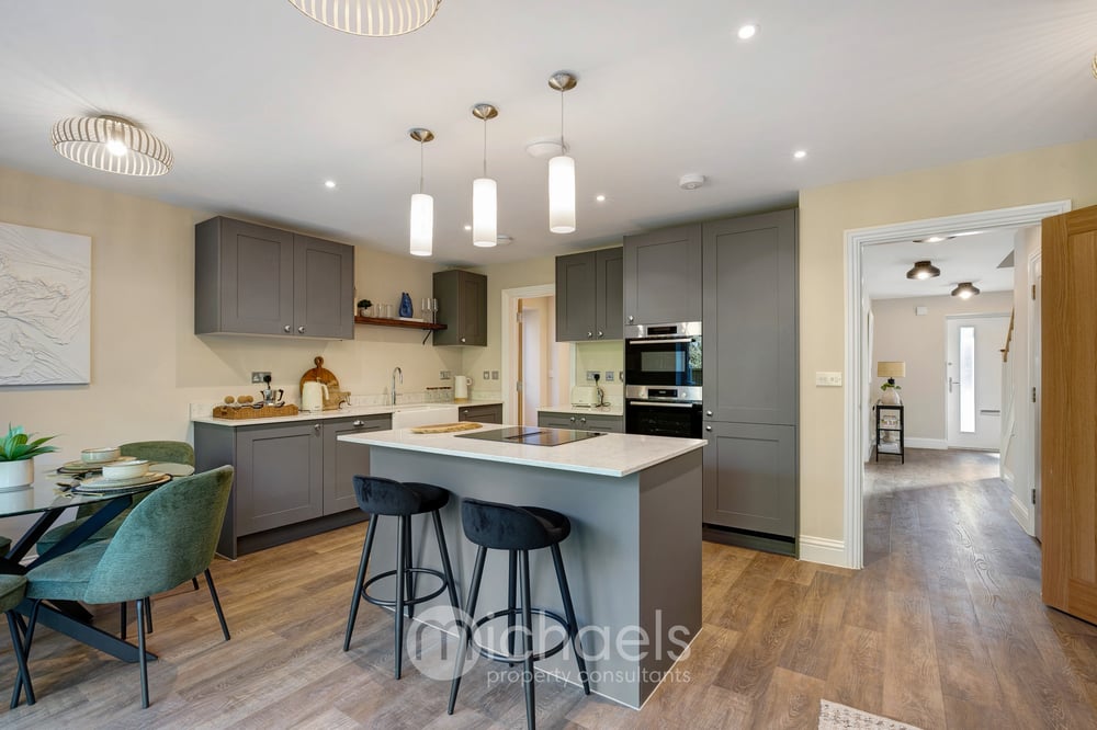 The interiors reflect a carefully considered balance of modern comfort and timeless elegance. Impressive bespoke kitchens are fully integrated, blending traditional features with contemporary fittings, and finished with high-calibre cabinetry, quality quartz work surfaces, matching splashbacks, and boiling water taps. Integrated appliances further enhance the functionality, while luxury vinyl flooring and plush carpets flow seamlessly throughout the home.