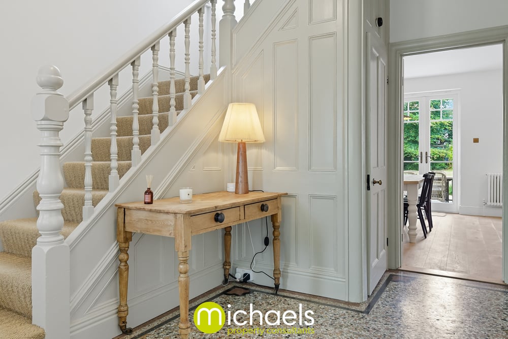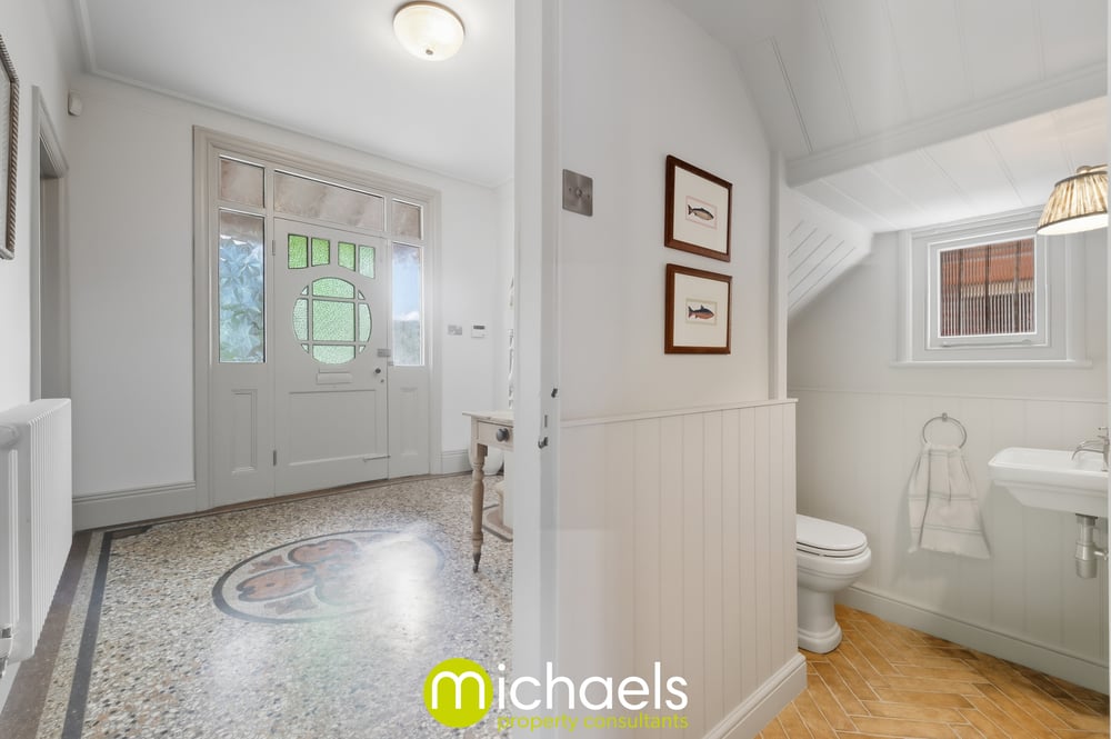 Step through the stained-glass front door into a truly elegant entrance hall, featuring the original terrazzo flooring, parquet accents, and a striking oversized sash window that bathes the space in natural light. A cleverly integrated under-stairs cloakroom/WC adds practicality while complementing the period aesthetic.