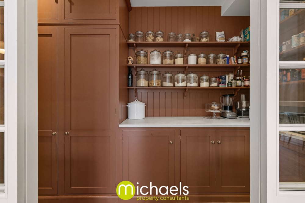 The heart of the home is the truly stunning Devol-designed kitchen-diner, hand-painted in Farrow & Ball’s ‘Jitney’. Centred around a double butler sink, the space features Perrin & Rowe brass taps (including a boiling water tap), integrated Smeg dishwasher, and generous storage. Adjacent lies the walk-in pantry/utility room, framed by a glazed partition and fitted with integrated appliances (washer/dryer by AEG, fridge and freezer by Smeg). Two additional Devol-crafted cupboards flank the kitchen fireplace—one a stylish bar cupboard with built-in wine racks and shelving, the other designed for practical storage, boot room space, and hanging coats.