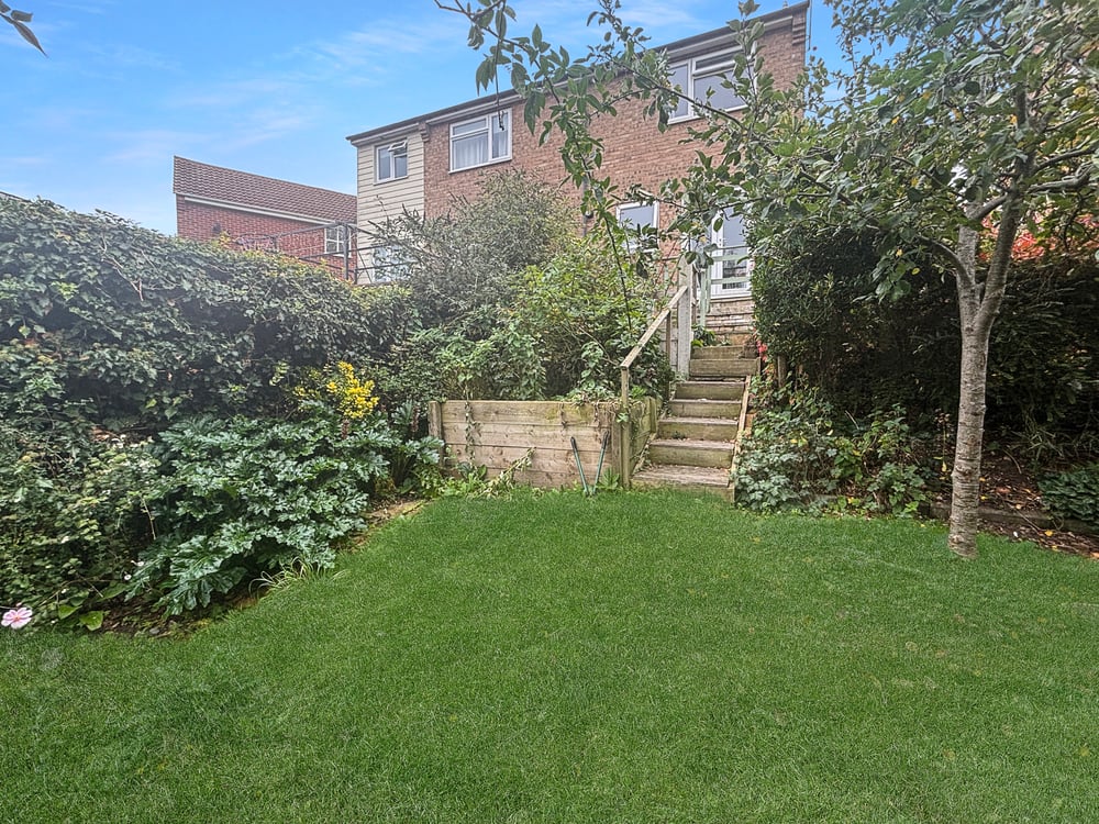 Patio area, steps leading down to the lawn area, retained by fencing and side access to driveway,