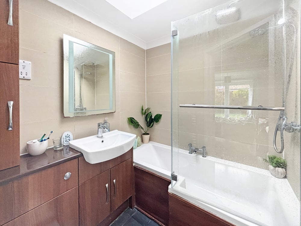 P shape bath with screen and shower over, vanity wash hand basin, vanity WC, heated towel rail, Velux Window, tiled walls, storage cupboard, shaver point, mirror with lighting.