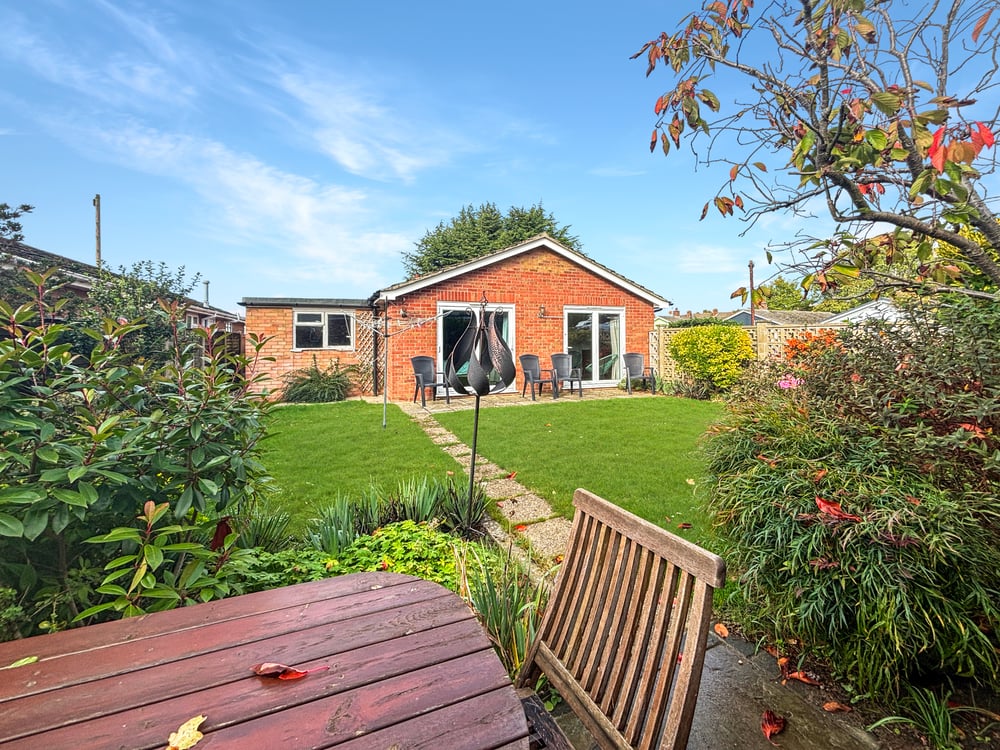Mainly laid to lawn, enclosed by fencing and walling, various shrubs and patio areas, gated side access.