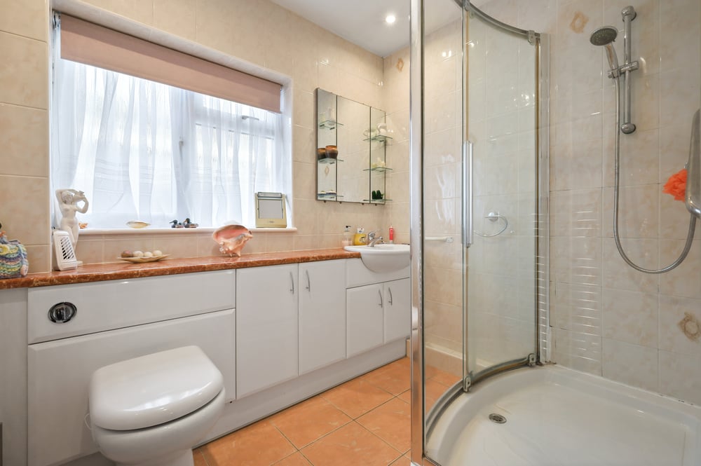 Window to side, a fully tiled room with corner shower and a full range of vanity sanitaryware including WC and wash hand basin, heated towel rail.