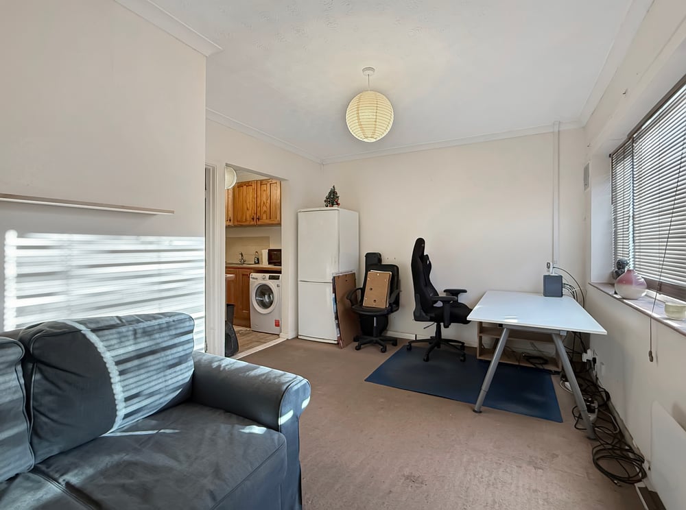 The accommodation comprises an entrance hall, double bedroom, fitted kitchen, comfortable living area, and a bathroom. Additional benefits include a garage en bloc and communal residents’ parking.